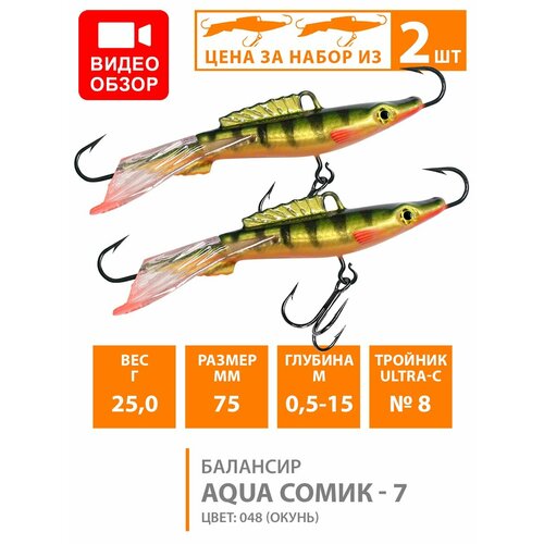 Балансир AQUA Classic-7 3D – этот балансир уверено можно отнести к «нестареющей классики» среди приманок для вертикального блеснения «всех времен и народов». Это первый из увидевших свет балансиров фирмы AQUA, моделей получила название CLASSIC и за прошедшие уже не просто годы, а десятилетия заслужено оправдал свое название. Эта модель и по сей день остается самой востребованной универсальной приманкой для ловли хищника, в первую очередь окуня, на глубинах до 5 метров. Техника игры балансиром не отличается сложностью – сначала приманку опускают практически на дно, потом выбрав слабину лески, выдерживают балансир на дне 7-10 секунд, при этом полезно слегка поигрывать приманкой, что может привести к поклевке находящегося вблизи хищника. Если результатов не последовало, балансир приподнимают на 10-15 сантиметров над дном и производят взмахи удильником примерно на 30 сантиметров, выдерживая при этом паузу в 4-6 секунд, а потом повторить движения ещё несколько раз – при такой игре приманка резко уходит в сторону, подымаясь вверх и затем плавно описывает «восьмерку» и возвращается в исходное положение. Как показывает практика, поклевка чаще всего происходит в момент опускания приманки ко дну. Данная методика позволяет облавливать все глубины водоема пока не найдется горизонт, где в настоящий момент стоит стая хищника. Плавники, мельчайшая чешуя, разделенная боковой линией, надбровные дуги над 3D глазами прорисованы с максимальной точностью. Использование флуоресцентных красок или голографического 3D покрытия которое реалистично имитирует мелкую чешую, не только полностью отражая падающий свет, но и разбрасывая блики в разные стороны подражая чешуйкам, отлетающим от убегающего малька с многокомпонентным защитным покрытием от царапин и сколов, позволяет балансиру быть более заметным для потенциального хищника, во всем диапазоне рабочих глубин, при любой погоде и времени суток. Отчетливо выделяющийся 3D голографический глаз-линза дополнительно провоцирует хищника на атаку, как бы задавая ему «точку прицеливания». Анализ многолетних исследований ученых ихтиологов, а так же специалистов в области гидродинамики, натолкнули конструкторов фирмы AQUA на мысль о том, что слабые турбулентные потоки, возникающие вокруг плавников живой рыбки, уходящей от преследования, отчетливо воспринимаются боковой линией хищника, стимулируя его продолжать атаку «до победного конца», в результате чего родился инновационный фигурный хвостовой стабилизатор который не только надежно крепится в корпусе благодаря оригинальному замку-фиксатору, что значительно снижает шанс поломки «хвостика» в процессе освобождения крючка из пасти хищной рыбы, но и создает такие же как и у живой рыбки турбулентные потоки, провоцируя его на атаку балансира, а «гидроакустический след», создаваемый потоком воды при прохождении через сложные формы хвостового стабилизатора и тянущийся за приманкой на протяжении всей траектории «полета» балансира побуждают хищника бросаться вдогонку за приманкой, даже если она уже прошла мимо. Дополнительная окраска хвостового стабилизатора в рубиново-красный цвет, по результатам тестирования, стабильно увеличивает улов на 17-23%. Нанесение многокомпонентного лакового покрытия защищает балансир от царапин, сколов и повреждений при ловле самы
