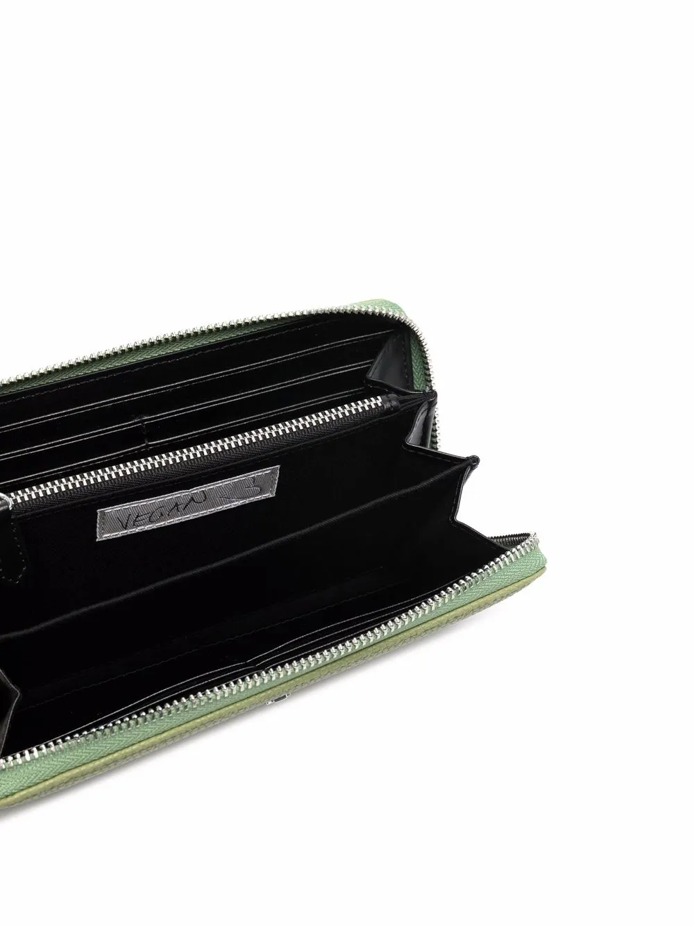 Металлический логотип, внутренние отделения для карт и внутренний карман на молнии.