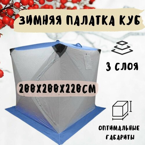 <p>Палатка -КУБ 3 местная трехслойная, предназначена для зимнего подледного лова. Каркас изготовлена из cтеклопластика с добавление карбона. Тент изготовлен из синтетической непродуваемой ткани (оксфорд 300PU) . Нижний тент стеганое полотно из синдепона и подкладочной ткани таффета (термостeжка).</p><br /> <br /> <p>Вес, кг: 9,1<br />Количество мест: 3<br />Количество слоев палатки: 3<br />Материал: оксфорд 300PU + синтепон + таффета<br />Размер, см: 220 х 220 х 205<br />Размер в упаковке 155х30х25 см<br />Форма палатки: куб</p>