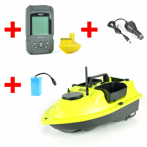 Товары в одном отправлении:1) Прикормочный кораблик Teltos аква про 2 (комплект)2) Эхолот Lucky FF718 (комплект)3) Дополнительный аккумулятор на кораблик4) Автомобильное зарядное устройство для кораблика 12В (в прикуриватель)На все товары (кроме аккумуляторов) действует гарантия.1) Прикормочный кораблик Teltos аква про 2 - кораблик с двумя погрузочными отсеками, общей грузоподъемностью 2 кг. Может доставить прикорм, снасти или эхолот в любое место в водоеме на расстояние до 500 метров.Катер оснащен мощным аккумулятором 5200 mAh, что позволяет ему быть на ходу до 4х часов, либо проплыть на расстояние до 2х км. Аккумулятор размещен в передней части корпуса корабля и имеет быстрый, практичный доступ для отключения или замены. На корме судна есть светодиодная индикация заряда батареи. Дальность радиосвязи корабля составляет 500 м, благодаря этому вы сможете забросить снасти в любое место в водоеме! Скорость передвижения - до 6 км/ч. Благодаря мощным электромоторам и трехлопастным винтам катер очень маневренный и может сделать разворот в радиусе 1 м.Яркие габариты кораблика легко видны с большого расстояния, вы без труда определите местоположение и направление судна даже в полной темноте.Погрузочный отсек имеет большой объем и грузоподъёмность 2 кг, в нем вы сможете перевести сразу очень много прикорма! Также в отсек можно положить снасти и забросить их в любое место водоема.Корпус кораблика герметичен и защищен от попадания влаги. Судно устойчиво ведет себя на волнах высотой до 1 метра даже при полной загрузке.Пульт управления удобен для использования одной рукой и имеет практичные клавиши для управления в условиях рыбалки. Ход корабля управляется одним джойстиком, имеет "Круиз контроль" - автоматическое движение в заданном направлении. Пульт работает на двух батарейках формата ААА.Технические характеристики:Материал: ABS пластикПитание лодки: 1 * Встроенная 7,4 В 5200 мАч аккумуляторная батарея (в комплекте) Питание пульта - батарейки 2 * AAA (входят в комплект)Время зарядки: около 10 часов Грузоподъемность: 2 кг Радиус действия пульта: до 500 мРазмер катера: 485*264*160 мм Вес катера: около 1,9 кгКомплектация кораблика:Катер для рыбалкиАккумулятор 5200 mAhЗарядное устройствоПульт управленияАнтеннаЗапасные винты - 2 шт.Батарейки для пульта - 2 шт.Гарантия 1 год.2) Lucky FF718 – удобный и простой в эксплуатации беспроводной эхолот для рыбалки. Оснащается беспроводным датчиком-лодочкой на батарейках. Неприхотлив в использовании, имеет все необходимые настройки для рыбака. Легко и быстро поможет Вам провести анализ водоема на глубине до 45 метров и сразу же оповестит Вас при наличии рыбы. Интуитивное управление всего тремя кнопками позволяет быстро ориентироваться в меню эхолота в любой ситуации, а крупные прорезиненные кнопки легко и четко нажимаются даже в дождь.Использовать эхолот можно как вместе с корабликом, прицепляя его к борту и запуская на дальние расстояния, так и раздельно (например - зимой, когда плавать по льду невозможно).Эхолот имеет подсветку всего дисплея для удобства использования в темное время суток.Настройки эхолота Lucky FF718 позволяют выбрать чувствительность работы сонара, единицы измерения, масштабировать изображение, включить или выключить сигнализацию рыбы и необходимой глубины при их обнаружении, а также многие другие настройки. Датчик эхолота работ