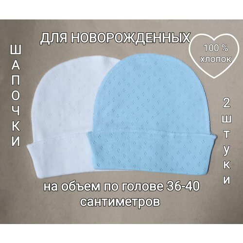 Универсальные хлопковые шапочки для новорожденных, 2 штуки. Нежные и мягкие, с швами наружу, имеют отворотик для регулировки размера, Подойдут на объем головы от 36 до 40 сантиметров. Незаменимы для роддома, удобны для дома , для улицы летом , и как поддева под тёплую шапочку в холодное время года. Нейтральный белый цвет подойдёт к любой одежде Вашего новорожденного малыша , а голубой украсит и выделит Вашего ребёнка!