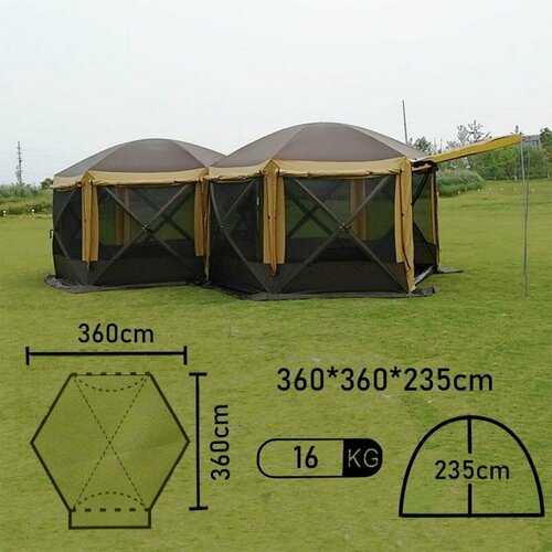 Вместительный шатер-палатка с одним входом для семейного отдыха или компании, материал: полиэстер, непромокаемая крыша и защита от ультрафиолетовых лучей. Размер: 300х300х225CM. Внешний материал: 420D, 100% Polyester PU 3000 мм. Внутренняя ткань: ткань &#43; сетка. Ткань пола: полиэтилен высокой плотности. Дуги из фибергласса d11 мм. Вес: 14кг. Шатер обеспечит комфортный отдых на природе. Быстрая сборка. Надежная защита от непогоды. Шатер-палатка полуавтоматический шестиугольный, идеален для кемпинга. Подходит для отдыха, рыбалки или охоты. Один вход, на всех сторонах москитные сетки, до половины сделан тканью. Размер&#xff1a; 300X300X225CM серия&#xff1a; 2019 TENTS SERIES материал&#xff1a; 420D оксфорд PU 3000MM, W/R, UV&#43; цвет&#xff1a; KHAKI , DARK YELLOW ПОЛ&#xff1a; полиэтилен высокой плотности каркас&#xff1a; фибергласовые дуги&#43;дверные палочки колышки&#xff1a; железные ВЕС&#xff1a; 16КГ