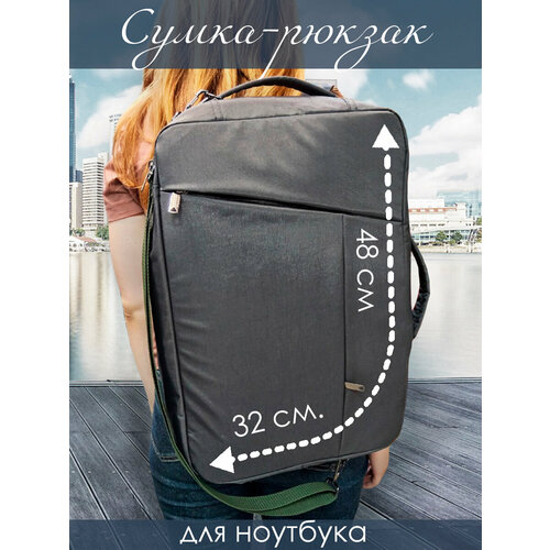 Сумка- рюкзак для ноутбука. Вмещает формат А4. В комплекте съемный плечевой ремень. Плечевые лямки убираются в потайной карман, при необходимости использования в формате сумки. Легкая модель с влагозащитной пропиткой. На лицевой стороне 2 кармана на молнии. С изнаночной стороны, карман для плечевых лямок. Внутри рюкзака, карман на молнии. Подклад плотный. внутренние швы обработаны тесьмой. вместимость 22 лит.
